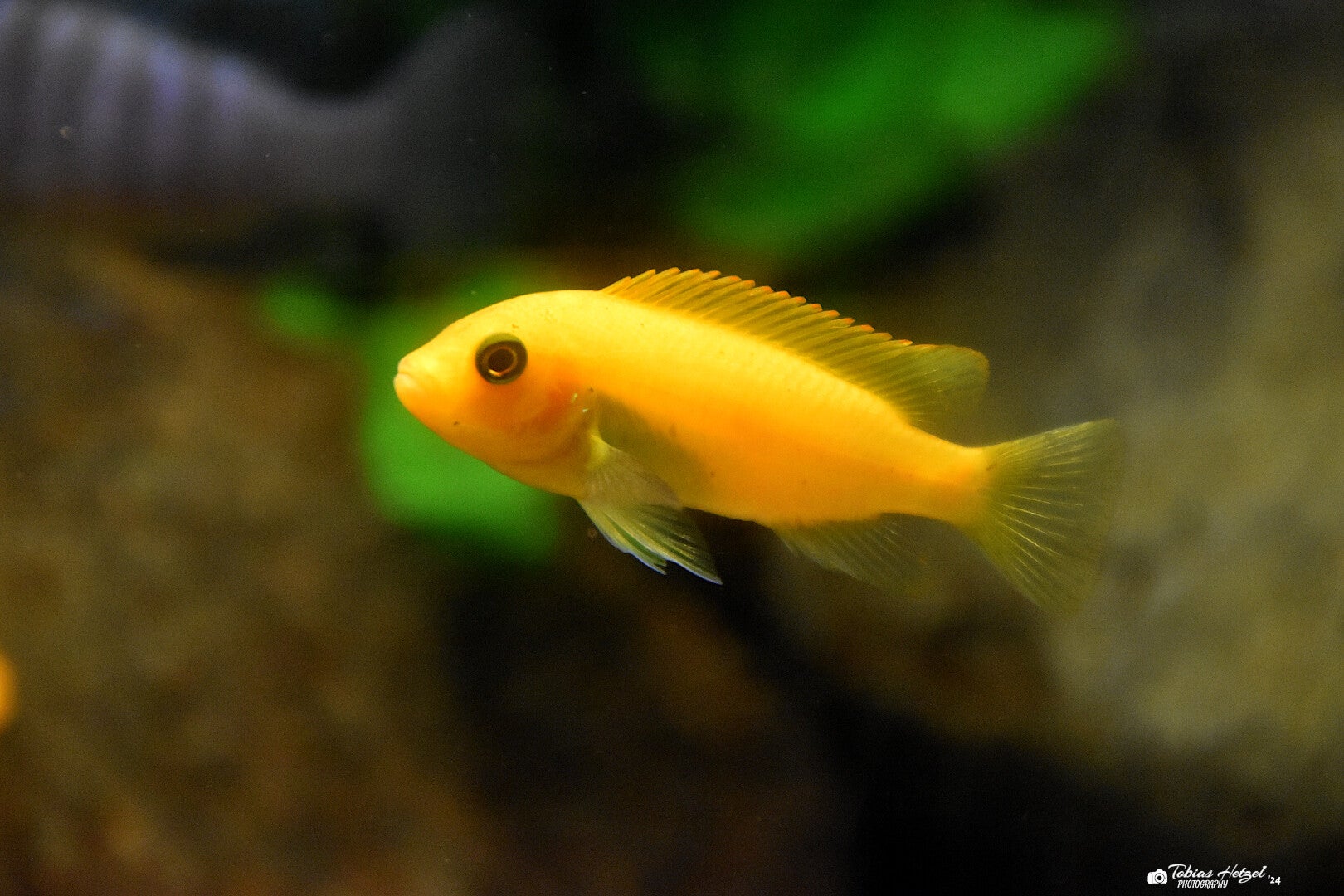 Der Gelbe Spitzkopf-Maulbrüter, auch als Dottergelber Malawibarsch, Zitronencichlide oder Goldener Buntbarsch bekannt, stammt aus dem Malawisee in Ostafrika. Er bewohnt dort felsige Uferzonen in Tiefen von bis zu 20 Metern. Diese farbenprächtige Buntbarschart erreicht eine Länge von etwa 10–12 cm und ist besonders durch ihr leuchtend gelbes, manchmal leicht bläulich schimmerndes Schuppenkleid bekannt. Der Gelbe Spitzkopf-Maulbrüter ist territorial, lebt jedoch in kleinen Gruppen und zeigt ein ausgeprägtes Brutpflegeverhalten: Die Weibchen tragen die befruchteten Eier und Jungfische im Maul, bis diese selbstständig sind. Er ernährt sich hauptsächlich von kleinen Wirbellosen und Algen, die er von Felsen abweidet. Aufgrund seiner friedlichen Art und attraktiven Färbung ist er auch im Aquarienhandel sehr beliebt. Im natürlichen Lebensraum gilt die Art laut IUCN als nicht gefährdet, doch lokale Bestände können durch Umweltveränderungen und Überfischung beeinträchtigt werden. In unseren Zoos ist die Art recht gut vertreten. So gibt es derzeit 24 öffentliche Haltungen in Deutschland und weitere 121 weltweit (Zootierliste Stand: 13.10.2025).