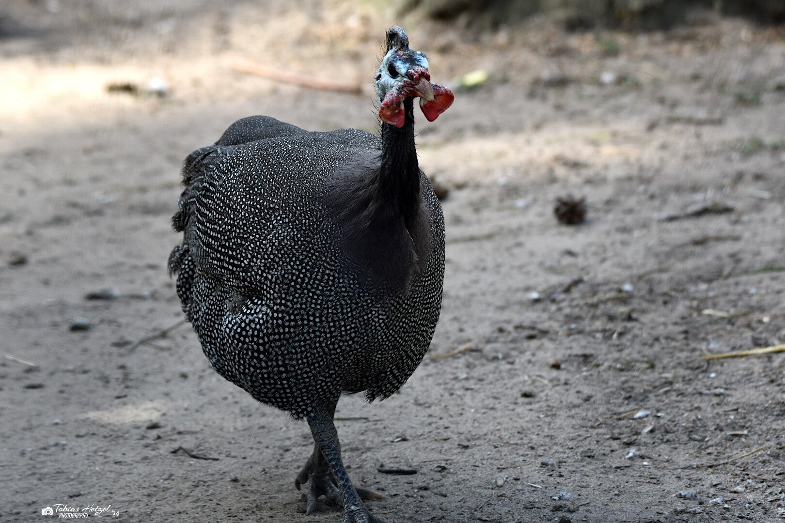Das Hausperlhuhn ist die domestizierte Form des Helmperlhuhnes, einer Art der Hühnervögel, aus der Familie der Perlhühner. In Afrika dienten Perlhühner seit jeher als Fleischlieferanten und ihre Federn wurden manchmal als Schmuck verwendet. Vor allem aber gehören sie zu den ersten Vögeln, die vom Menschen domestiziert wurden. Seinen Anfang nahm die Domestizierung wohl in Ägypten, wo die Tiere während des frühen Altertums noch wild vorkamen. Auch die Phönizier und Griechen hielten Perlhühner, lange noch bevor das Haushuhn in Europa bekannt wurde. Waren die Tiere noch bei den Römern eine beliebte Delikatesse, verschwanden sie nach dem Untergang des Römischen Reiches nahezu vollständig aus Europa. Erst im 15. Und 16. Jahrhundert, als die Portugiesen Perlhühner aus Westafrika mitbrachten, erfolgte die Domestikation ein zweites Mal. Heute werden die Tiere weltweit gezüchtet, stehen in ihrer Bedeutung jedoch weiter hinter der des Haushuhnes oder des Truthahnes. In unseren Zoos ist das Hausperlhuhn gut vertreten. So gibt es weltweit aktuell 364 öffentliche Haltungen, wovon sich 68 in Deutschland befinden (Zootierliste Stand: 28.02.2024).