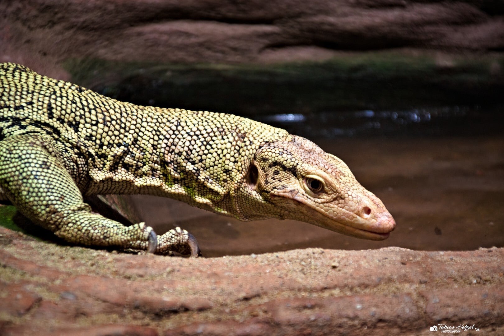 Der Quittenwaran ist eine seltene Waranart, die auf den Molukken-Inseln Indonesiens beheimatet ist. Er lebt in tropischen Regenwäldern und bevorzugt feuchte, dicht bewachsene Gebiete. Mit einer Körperlänge von bis zu 120 cm ist er ein mittelgroßer Waran. Sein auffällig gelb-grünes Schuppenkleid dient als Tarnung in der Vegetation. Als geschickter Kletterer verbringt er viel Zeit auf Bäumen. Der Quittenwaran ist ein opportunistischer Jäger und frisst Insekten, kleine Säugetiere und Eier. Durch Lebensraumzerstörung und den illegalen Tierhandel gilt die Art als stark gefährdet. In unseren Zoos findet man die Art nur relativ selten. So gibt es neben zwei öffentlichen Haltungen in Deutschland weltweit weitere 31 Haltungen (Zootierliste Stand: 17.03.2025).