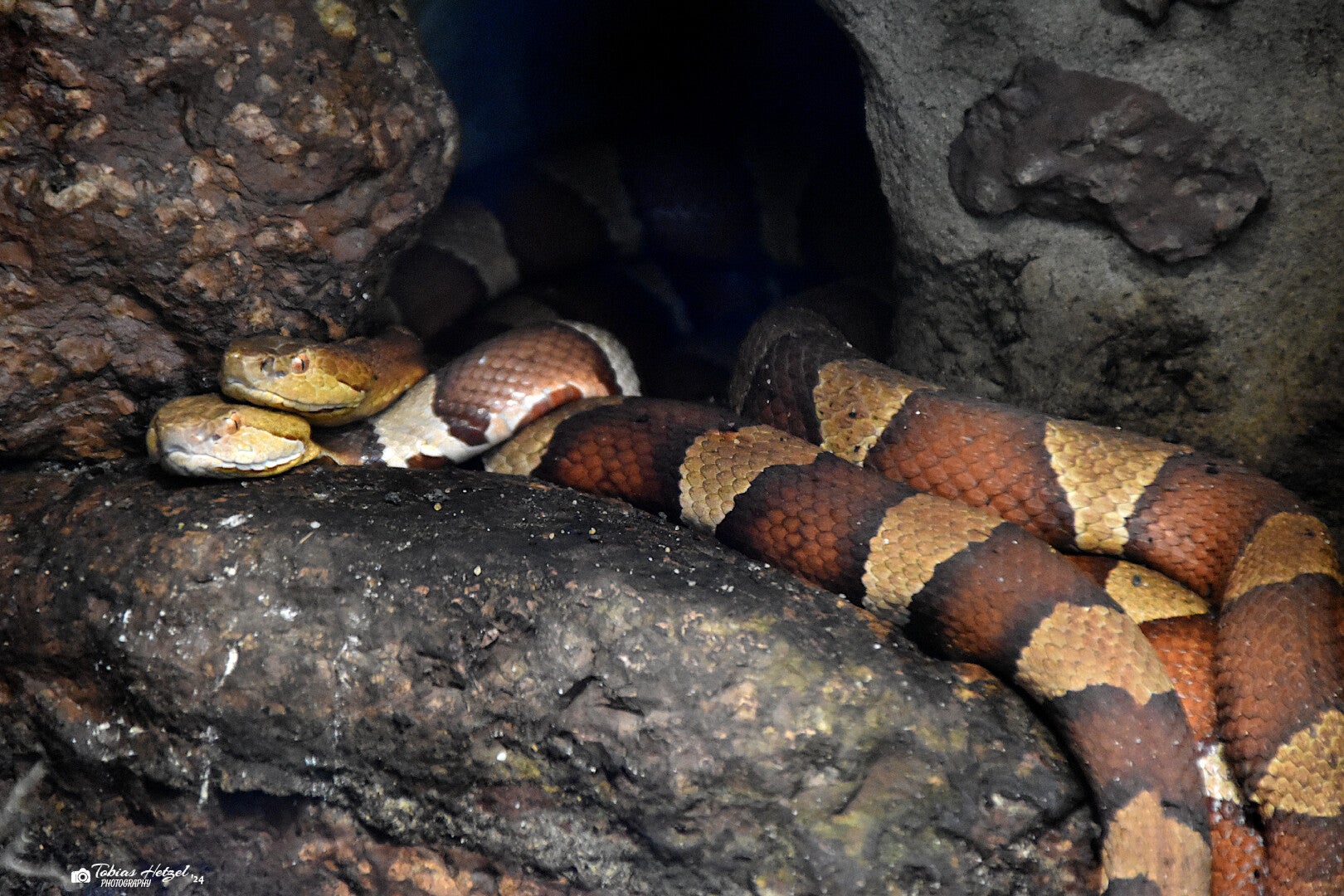Der Breitband-Kupferkopf ist eine von 5 Unterarten des Nordamerikanischen Kupferkopf. Er gehört innerhalb der Familie der Vipern zu der Gattung der Dreieckskopfottern. Er erreicht eine Länge von rund 90 Zentimeter, in seltenen Fällen auch bis 1,2 Meter und kommt in Texas, Oklahoma und Kansas vor. Die dämmerungs- und nachtaktive Schlange hält sich tagsüber meist in Erdhöhlen, Steinhaufen oder Baumstümpfen auf. Der bevorzugte Lebensraum sind lichte Wälder, Feuchtwiesen und Bergregionen mit Höhen von bis zu rund 1.000 Metern. Gelegentlich ist er auch auf Agrarflächen wie Wiesen und Felder anzutreffen. Der Breitband-Kupferkopf frisst alles, was er überwältigen kann. Sein Spektrum reicht von Kleinsäugern wie Mäusen und Ratten, über Vögel, Reptilien, Amphibien bis hin zu Insekten. Die Schwanzspitze der Kupferköpfe ist auffallend türkis-grün gefärbt und wird als Wurmimitat verwendet, um z. B. Vögel anzulocken. Das Gift dieser Schlange, ein Hämotoxin mittlerer Stärke, ist zwar sehr schmerzhaft, aber in der Regel für einen Erwachsenen nicht tödlich. Aktuell kann man den Breitband-Kupferkopf nur noch in zwei Zoos im EAZA-Raum sehen, davon ist einer in Deutschland (Trettau) und der andere in Finnland (Helsinki) (Zootierliste Stand: 17.05.2021).