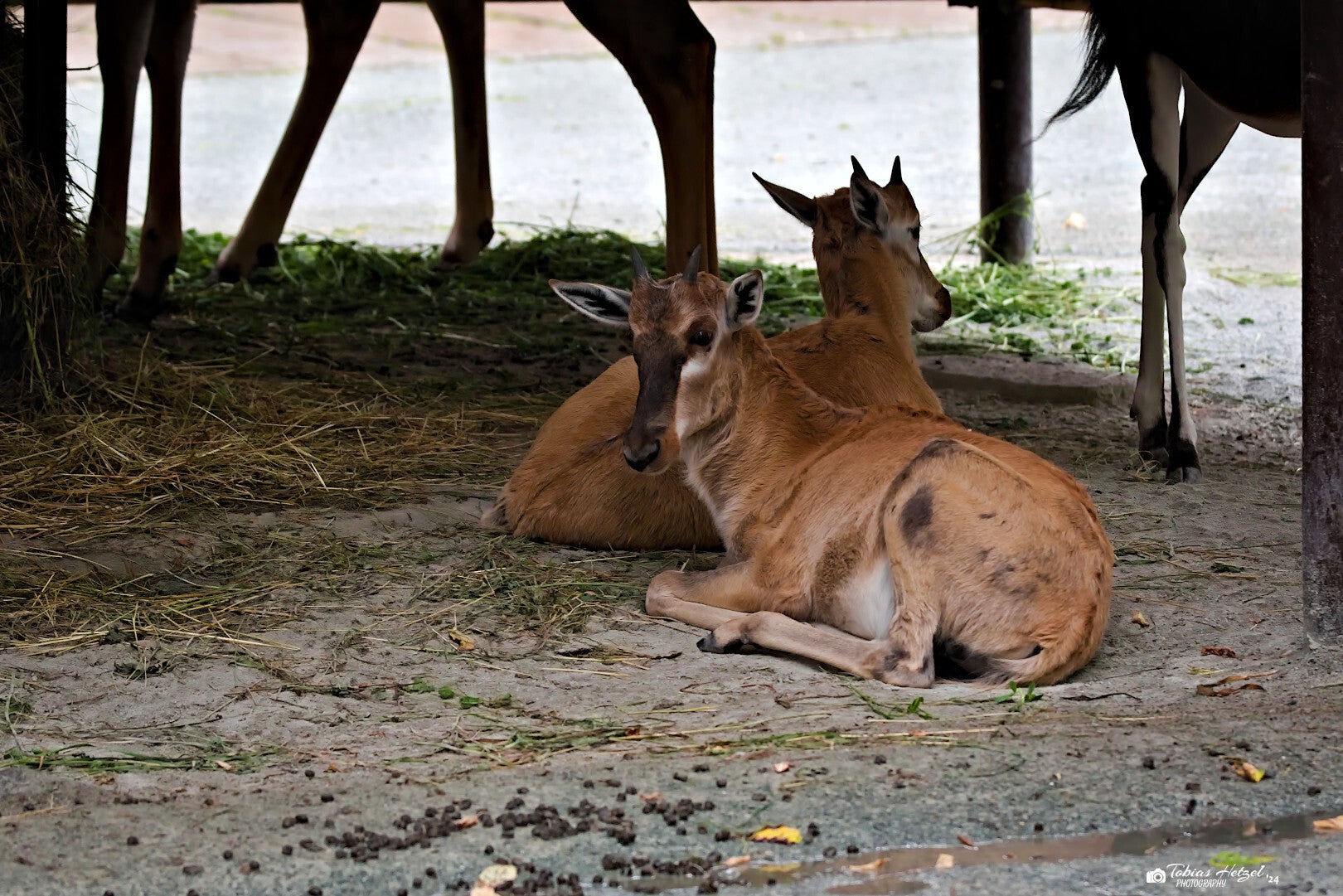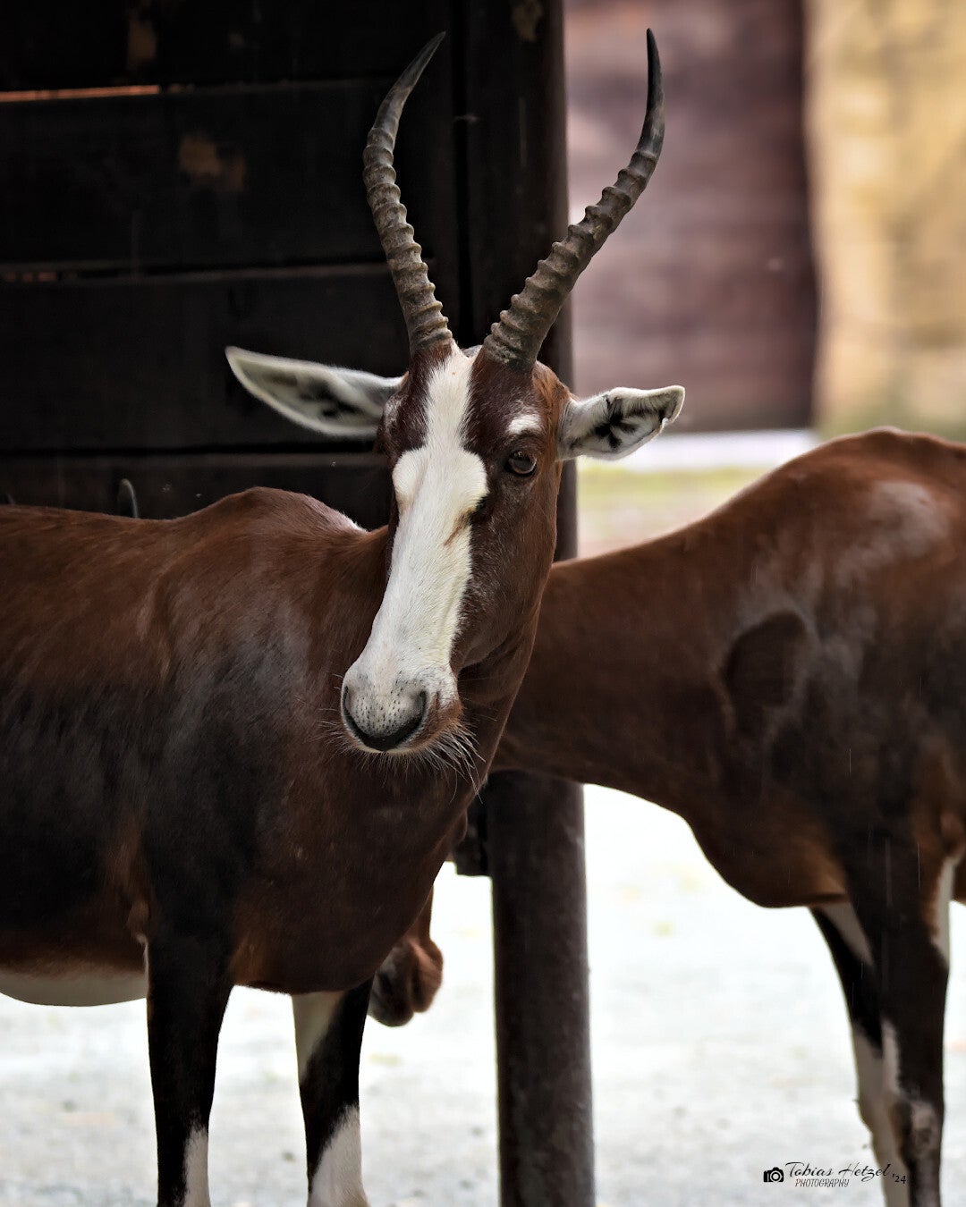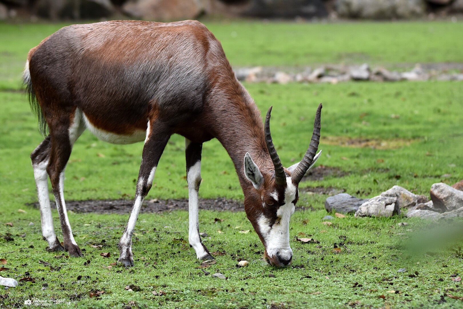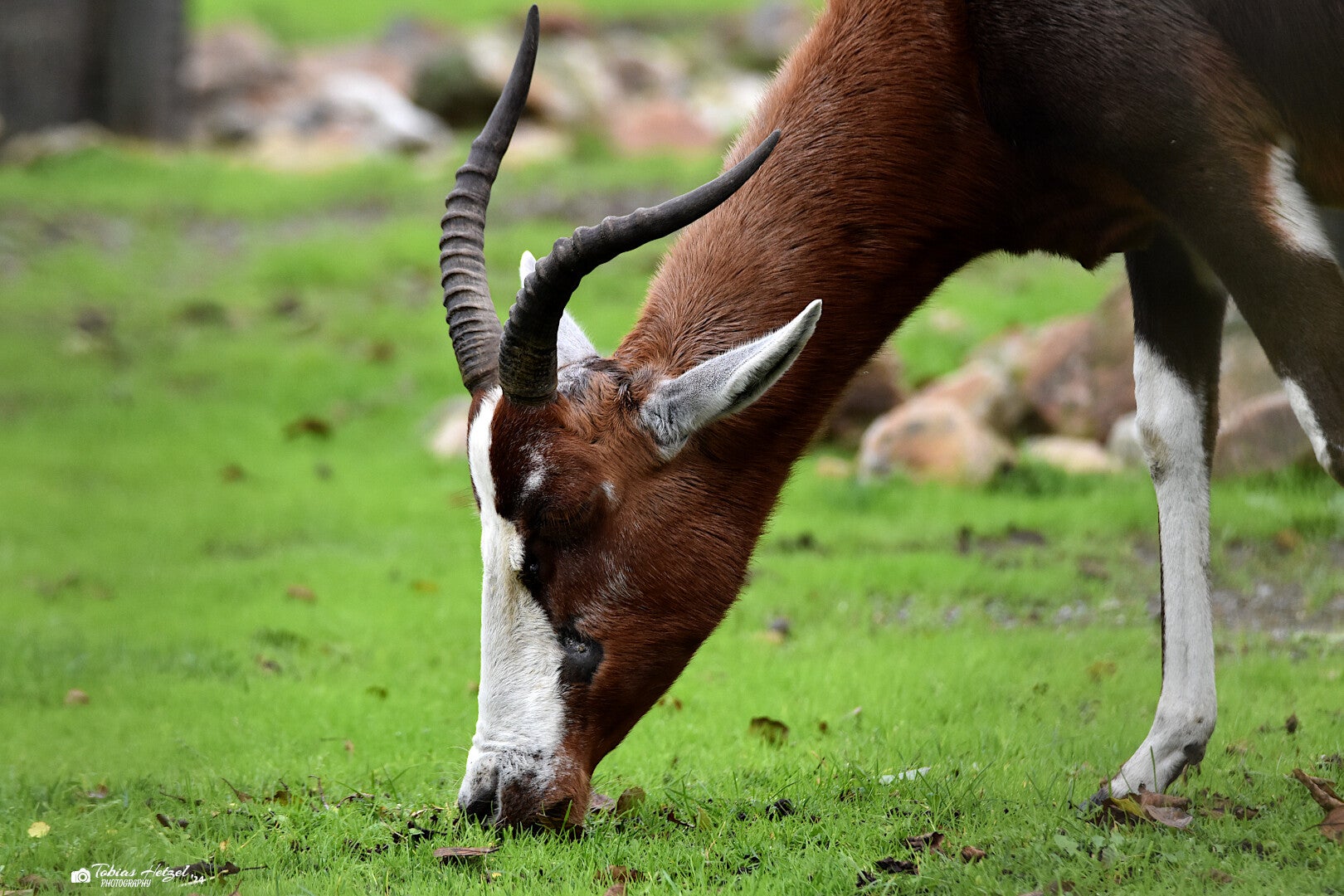 Der Blessbock ist eine Unterart des Buntbock innerhalb der Familie der Hornträger. Er ist im südlichen Südafrika verbreitet und bewohnt dort bevorzugt offenes Grasland und Savannen mit ausreichend Grasbewuchs. Blessböcke sind sehr gesellig und leben in großen Herden. Es kommen sowohl reine Weibchen-Herden, reine Junggesellengruppen als auch gemischte Herden vor. Diese Herden können bis zu 70 Tiere umfassen. Es handelt sich um tagaktive Antilopen, die während der heißen Tageszeit meist an schattigen Plätzen ruhen. Die bis zu 160 cm großen Tiere ernähren sich als reine Pflanzenfresser ausschließlich von Gräsern und Kräutern, die sie in ihrem Lebensraum finden. Auf dem Nasenrücken ist deutlich eine große Blesse zu erkennen, welcher sie ihren Namen verdanken. Zu den Hauptfeinden zählen insbesondere Löwen, Leoparden, Geparden und Hyänen. Blessböcke kamen einst in riesigen Beständen vor. Wie viele andere im offenen Grasland lebende Arten wurden sie jedoch zur Gewinnung von Fleisch und Fell oder einfach aus Vergnügen stark bejagt, so dass gegen Ende des 19. Jahrhunderts gerade einmal noch 2.000 Tiere übrig waren. Durch Schutzmaßnahmen und gutes Management, hauptsächlich auf privatem Farmland, haben sich die Bestände gut erholt. Heute dürfte es Schätzungen zu Folge wieder rund eine Viertelmillion Tiere im südlichen Afrika geben. Dass etwa 97 % Blessböcke auf eingezäuntem Privatland vorkommen, hatte ähnlich wie beim Damhirsch oder dem Spießbock, einen gewissen Domestikationseffekt, indem es mittlerweile auch weiße, gelbe, rote oder schwarze Zuchtstämme gibt. Die IUCN listet die Art als nicht gefährdet. In unseren Zoos findet man sie insgesamt 66 Mal weltweit, davon 8 Mal in Deutschland (Zootierliste Stand: 19.11.2024).